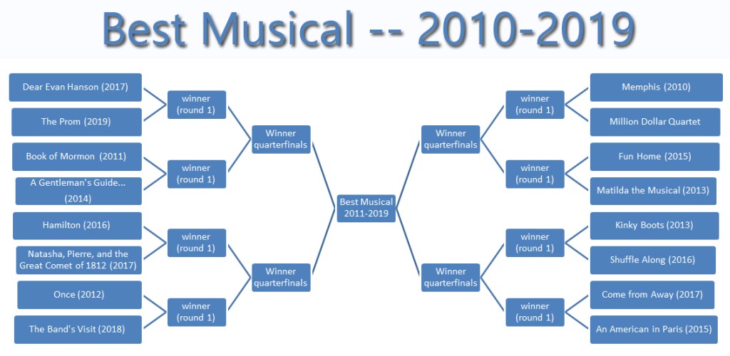 I started by including the Best Musical winner from each year from 2010-2019. Unfortunately, a glowing omission exists because I have not yet seen Hadestown, so the 2019 Best Musial winner is not in the tournament. However, the other nine Tony winners from the decade are included along with seven wildcards–my seven favorite nominees that did not win Best Musical in their respective years.